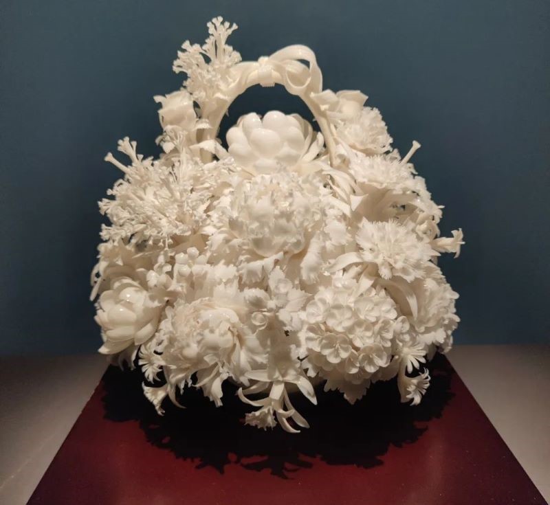 这件艺术品初看上去,任谁都会夸赞一声雕刻技术好,都会以为这是用一块象牙雕刻而成的花篮,但是你错了,这是用白瓷烧制而成的,在烧制过程既没有烧变形也没有碎裂。
