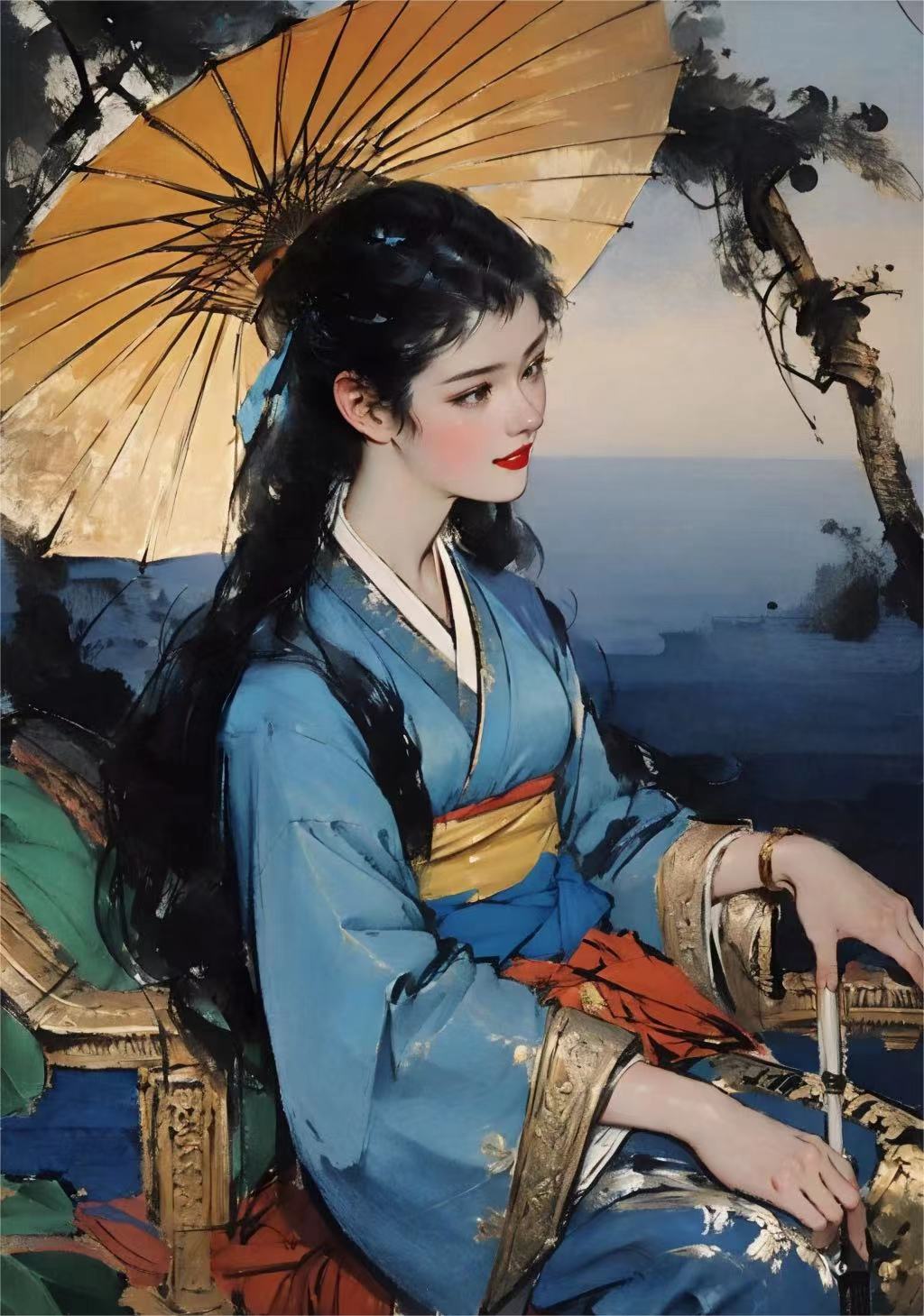 这种新颖的AI水墨画风,不知道喜欢的人多不多,在它这些画里面人物的形象更多像是西方人物的美感结合中国古代女子的美感所结合的。这种画面给我感觉间接明了,清新脱俗,瞬间让我觉得有点清新脱俗的感觉。