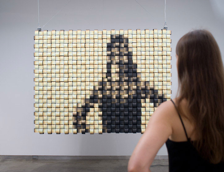 他的作品探索了自我感知的主观性,使用各种材料,金属、木钉、硬币、玩偶,甚至街头垃圾。但原理都是一样,就是用kinect摄像头捕捉前面人们的影像,经过图像处理之后转化成电信号去控制“镜子“背后的一个个小马达,让这些单体各自转到相应的角度,如此一来,在视觉上就会有明暗或色彩的区分,最终呈现出来的效果就是像镜子一样,可以“照”出你的影像了。