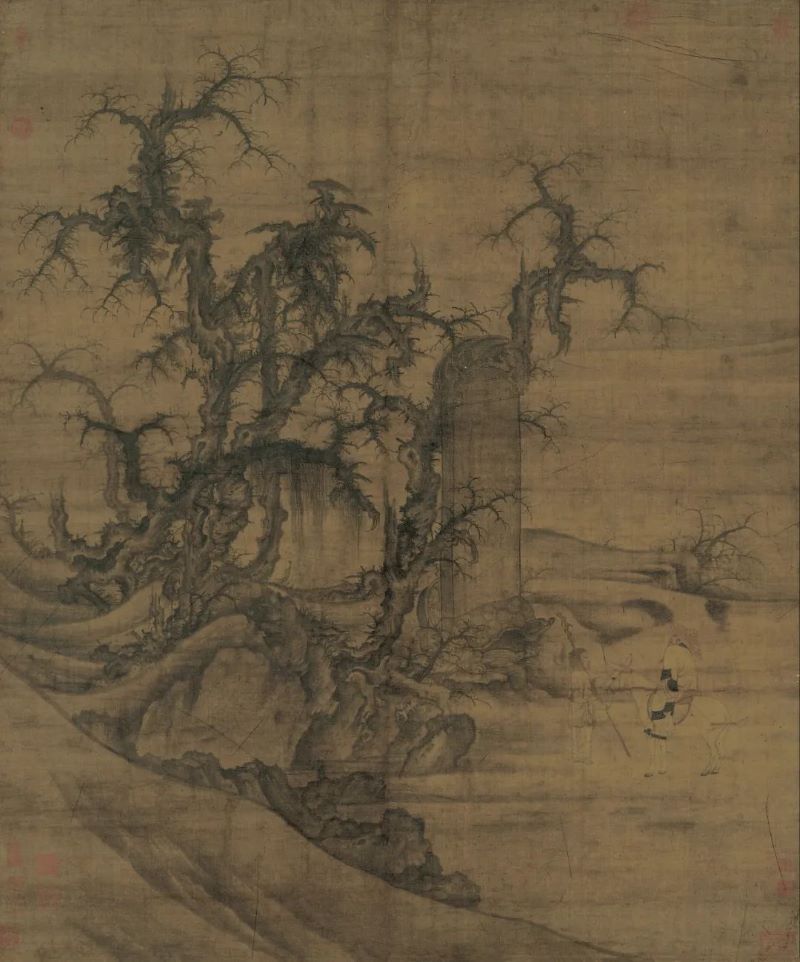 画面上,荒野平坡迤迆,寒林古木嵯岈,林中凄凄然立一尊古碑,碑下寂寂然见一位观者。物象疏朗,笔墨简淡,绝称不上丰富多姿,全然一副悱恻萧条。其中,李成并未刻意营造空间的辽远,而是着力于描绘萧索的气氛,引发苍凉的感情。