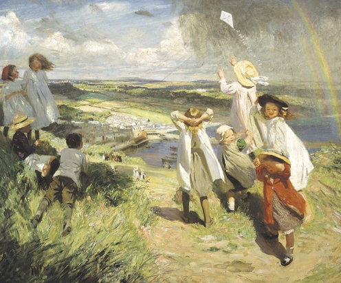 风筝实际上已有数千年的历史,关于放风筝的第一份记录在案的报告来自我国古代汉代(公元前 206 年 - 公元 220 年),当时风筝被用于军事用途,例如,帮助计算距离。它们还被用来传递重要信息,有时(以非军事身份)传递浪漫信息。出于实用和娱乐的原因,风筝的使用在亚洲传播开来,最终到达了中世纪的欧洲。劳拉·奈特夫人围绕这“风筝”这个主题展开了创作,在1910年创作了这副画作《放风筝》,这副画作展示了一群无忧无虑的孩子,头发在风中飘扬,在俯瞰纽林港的高山上。这幅画于 1910 年完成后不久就在皇家学院展出,随后被开普敦(南非)的南非国家美术馆买下,并一直保存至今。劳拉·奈特夫人是一位具象主义,现实主义传统的画家,在她漫长的绘画生涯中,奈特是英国成功且受欢迎的画家之一。她从小在窘迫的生活接触学习艺术,她独立且坚强的性格让她得到了许多的成就。在创作中,后台的芭蕾舞者、马戏团演员、吉普赛人和流浪汉等人物形象都成为她描绘的主题,尤其是以表现伦敦戏剧和芭蕾舞者的作品而闻名。