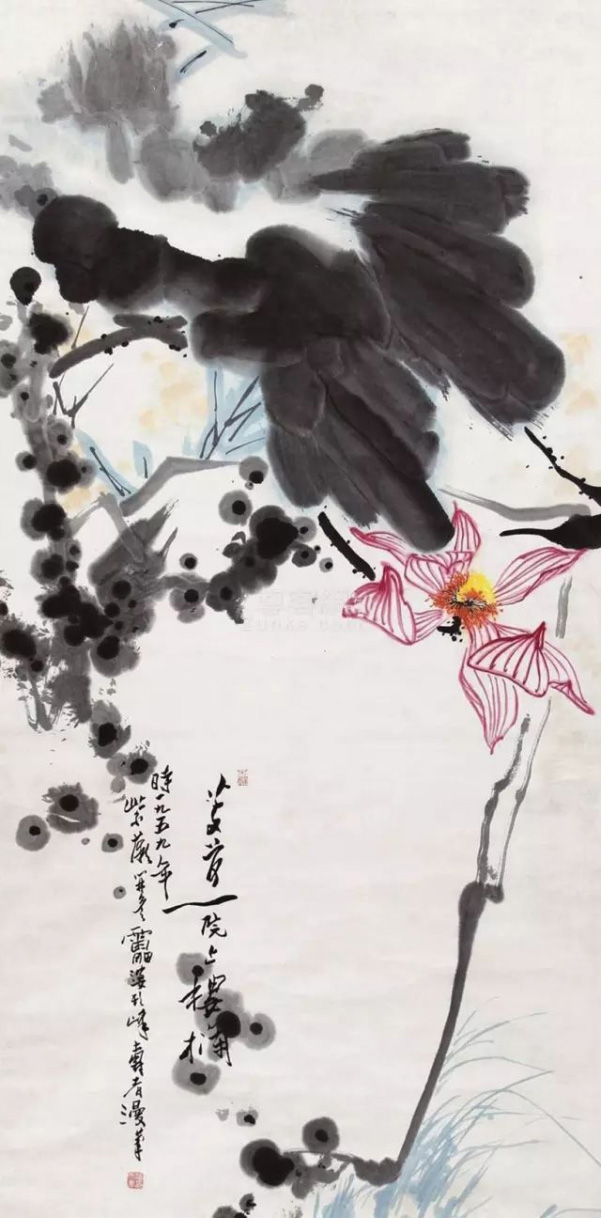 潘天寿对写意花鸟和山水画的技艺研习之精,尤其擅长画雄鹰和松梅等。画面的整体风格气势雄浑,大胆落笔,但是细节之处又耐人寻味,用点染的方式进行渲染。
