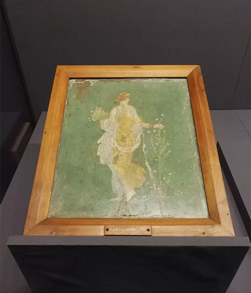 壁画描绘了一位正在采花女子的背影,她代表春天与鲜花,女子身着白衣黄裙长袍头戴花冠,金色的秀发被松松的挽于脑际,漏出温柔白皙的颈部,宽大、轻盈的衣袍随风飘舞。在绿色的背景上她赤着脚,迈着轻盈的步伐微微向后回首,她仿佛正在花园中一边舞蹈一边采摘着花朵,宣告春天已经来临。
