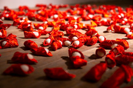 作品以蚕为媒介,每件作品背后都隐藏着更深层的隐喻。他把每只蚕都当成了"宝宝",用红色丝绸织成襁褓,温暖的包裹着蚕茧,像是熟睡的婴儿,观众可以领养它们。梁绍基的风格独树一帜,几乎所有作品都跟蚕共同完成,梁绍基将蚕看作生命的一部分,在蚕吐丝的过程中,他连续几天通宵守候,在他19年举办的展览《我蚕,蚕我》,就这个名字,我们可以感受到他与蚕之间不分你我的关系。他曾说,“人来到世上,就是为了留下蛛丝马迹”